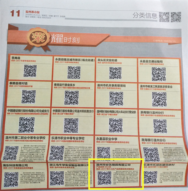 Wenzhou Daily News honor Anda "One of the most Reliable companys in Wenzhou" 2017/11/10