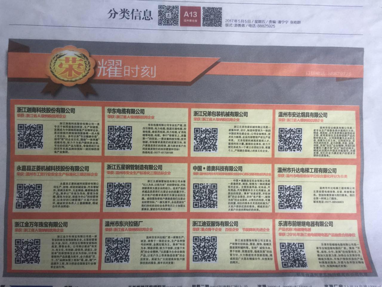 Wenzhou Anda Smoking Sets Co., Ltd was named Top 12 Wenzhou Elite Company Award in Wenzhou City News on July 5th, 2017.